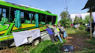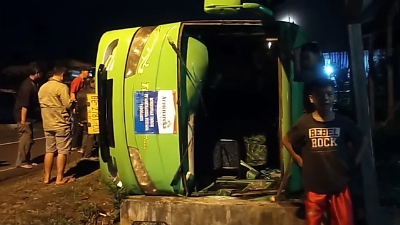 “Sehingga sopir bus berusaha menghindari tabrakan dengan banting setir ke kiri. Diduga karena kecepatan bus yang cukup tinggi, mengakibatkan bus terguling,” beber mantan Kasat Lantas Polres Pesawaran itu.