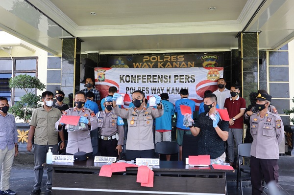 Blambangan Umpu (translampung.id) – Kapolres Way Kanan AKBP Teddy Rachesna didampingi Kabag Ops Kompol Suharjono dan Kasatres Narkoba Iptu Mirga Nurjuanda melakukan ekspose hasil kegiatan team Satgas Operasi Antik Krakatau 2022 yang dilaksanakan selama 14 (empat belas) hari terhitung mulai tanggal 18 s.d. tanggal 31 Maret 2022 ini di Mako Polres Way Kanan, Kamis (7/4/2022).