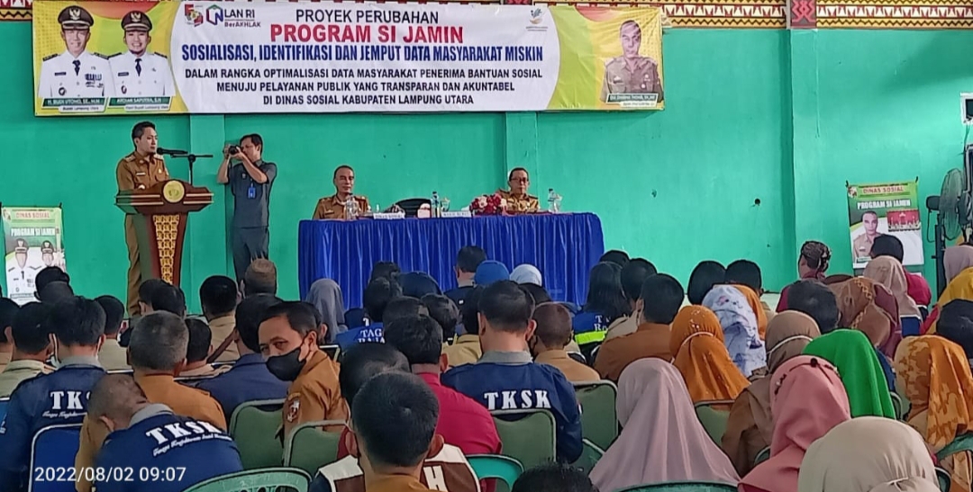 LAMPUNG UTARA – Dalam rangka optimalisasi data masyarakat penerima Bantuan Sosial untuk menuju pelayanan publik yang transparan dan akuntabel, Pemkab Lampura melalui Dinas Sosial setempat adakan Program Si Jamin sosialisasi identifikasi dan jemput data masyarakat miskin.