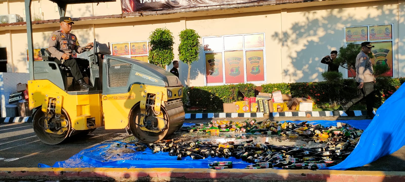 “Sekitar 600 botol minuman keras berbagai merek telah dimusnahkan dengan cara memakai alat berat Buldozer. Dan 220 botol minuman keras lainnya diserahkan di Polda Lampung,” kata Kapolres.