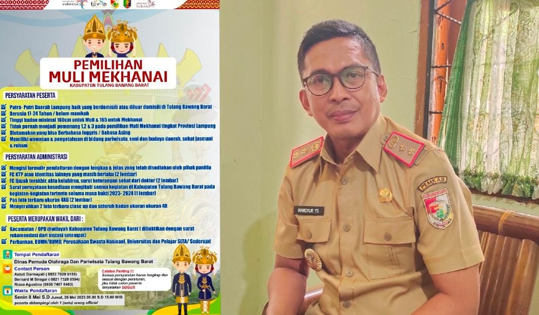 PANARAGAN (translampung.id)– Dinas Pemuda Olahraga dan Pariwisata (Disporapar) Kabupaten Tulangbawang Barat (Tubaba) Lampung, resmi membuka pendaftaran Pemilihan Muli Mekhanai Tahun 2023.