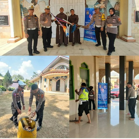“Setiba dilokasi personel Salantas Polres Way Kanan langsung membersihkan sekitar masjid At-taqwa dan Gereja Katolik Keluarga Kudus di Kecamatan Baradatu Kabupaten Way Kanan. Ada yang nyapu, ngepel, nyabutin rumput dan memungut daun serta sampah dengan berbagai peralatan seadanya di sekitar halaman tempat ibadah tersebut. Tak hanya membersihkan tempat ibadah, Satlantas Polres Way Kanan juga memberikan bantuan paket sarana alat kebersihan kepada pengurus Masjid dan Gereja , yang nantinya bisa digunakan untuk keperluan bersih-bersih. Mudah-mudahan dengan bakti sosial ini dapat menjalin sinergitas antara kita dengan tokoh agama maupun para jemaah di tempat ibadah tersebut,” ujar Kasatlantas Polres Way Kanan ini. (Yudi)