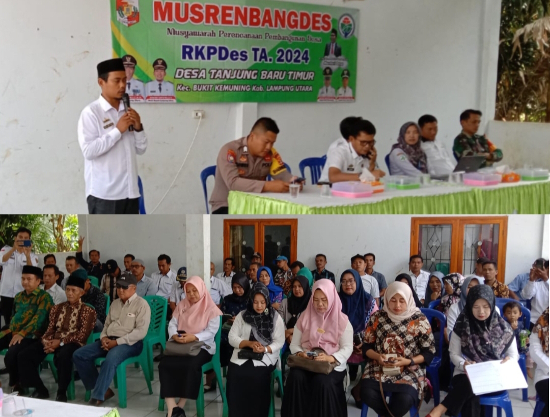 LAMPUNG UTARA – Pemerintah Desa Tanjung Baru Timur Kecamatan Bukit Kemuning menggelar Musyawarah Perencanaan Pembangunan Desa (Musrenbangdes) RKPDes TA 2024, Di aula kantor desa setempat, kamis (21/9/2023)