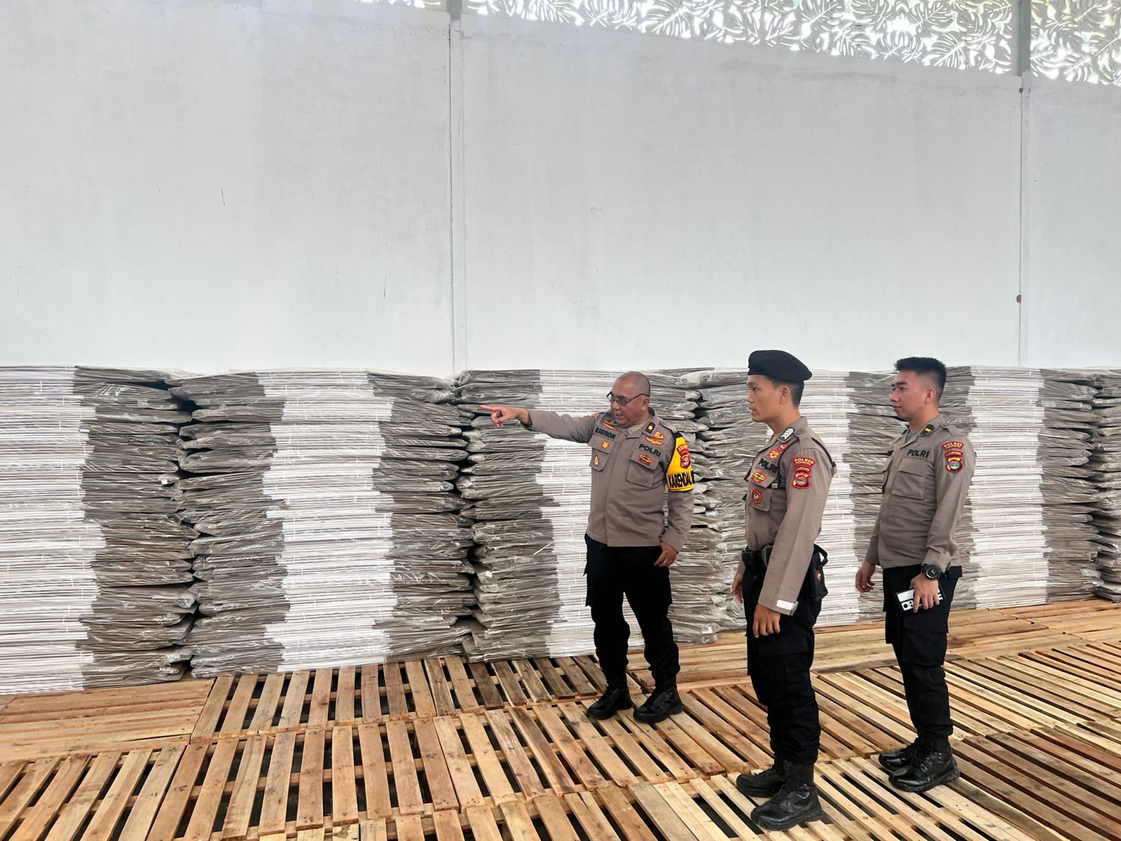 Pringsewu- Kabag Operasional (Kabag Ops) Polres Pringsewu, Kompol Kisron, melakukan peninjauan dan pemeriksaan terhadap logistik Pemilihan Umum (Pemilu) di gudang Komisi Pemilihan Umum (KPU) setempat Kabupaten Pringsewu, di komplek perkantoran Pemda Pringsewu. Kamis (26/10).