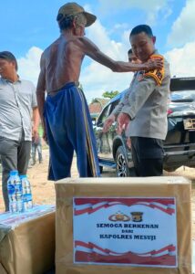 Selang beberapa menit, Kapolres Mesuji lantas memberikan bingkisan dua kardus berisi sembako dan tali asih yang memang selalu tersedia di mobil kendaraan miliknya.
