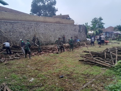 Pasca gempa Sumedang, TNI bersama masyarakat bergotong royong membersihkan puing-puing bangunan pasca gempa bumi di Dusun Tegal Panjang RT 02/01, Desa Cikoneng, Kecamatan Ganeas, Kabupaten Sumedang dan melaksanakan kegiatan karya bakti pembersihan material puing-puing bangunan Pasar Pemda, Desa Cikaramas.