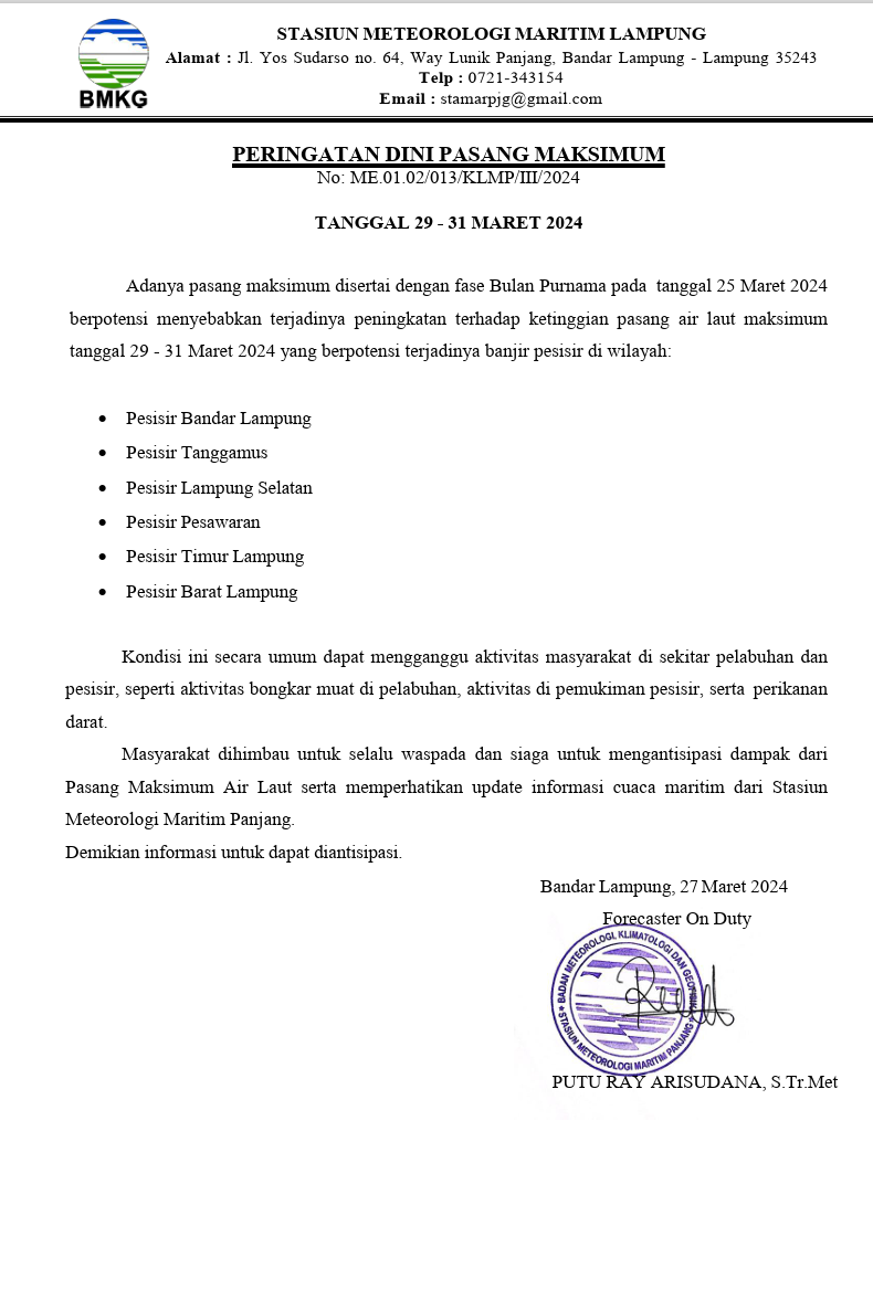 Dalam PDF surat resmi berlogo BMKG, bernama instansi Stasiun Meteorologi Maritim Lampung alamat di Way Lunik, Kecamatan Panjang, Kota Bandarlampung, bernomor surat: ME.01.02/013/KLMP/III/2024 tertanggal 27 Maret 2024 dengan cap dan ditandatangani oleh Forecaster On Duty, Putu Ray Arisudana, S.Tr.Met., disebutkan bahwa pasang maksimum air laut diprediksikan terjadi Jumat (29/3/2024) hingga Minggu (31/3/2024).