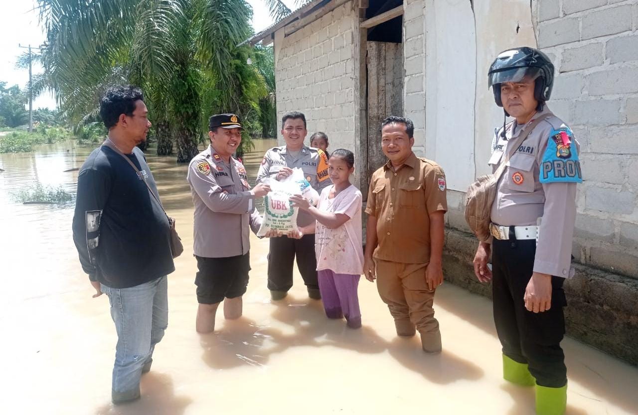 MESUJI – Kapolsek Way Serdang bersama para Kanit dan Anggota Bhabinkamtibmas serta Aparatur Desa Labuhan Batin, Kecamatan Way Serdang, Kabupaten Mesuji mengecek lokasi yang terdampak luapan air sungai.