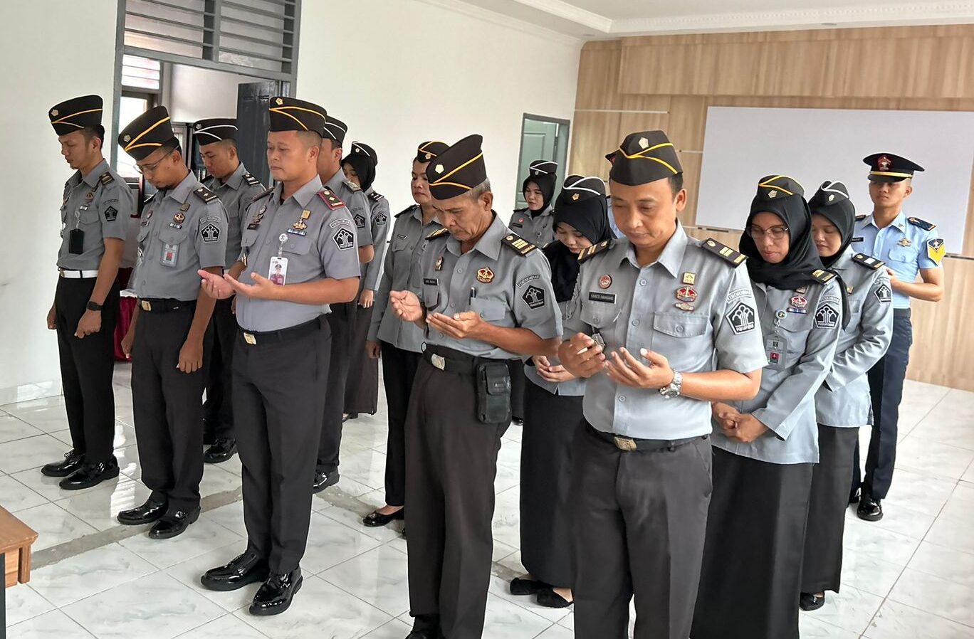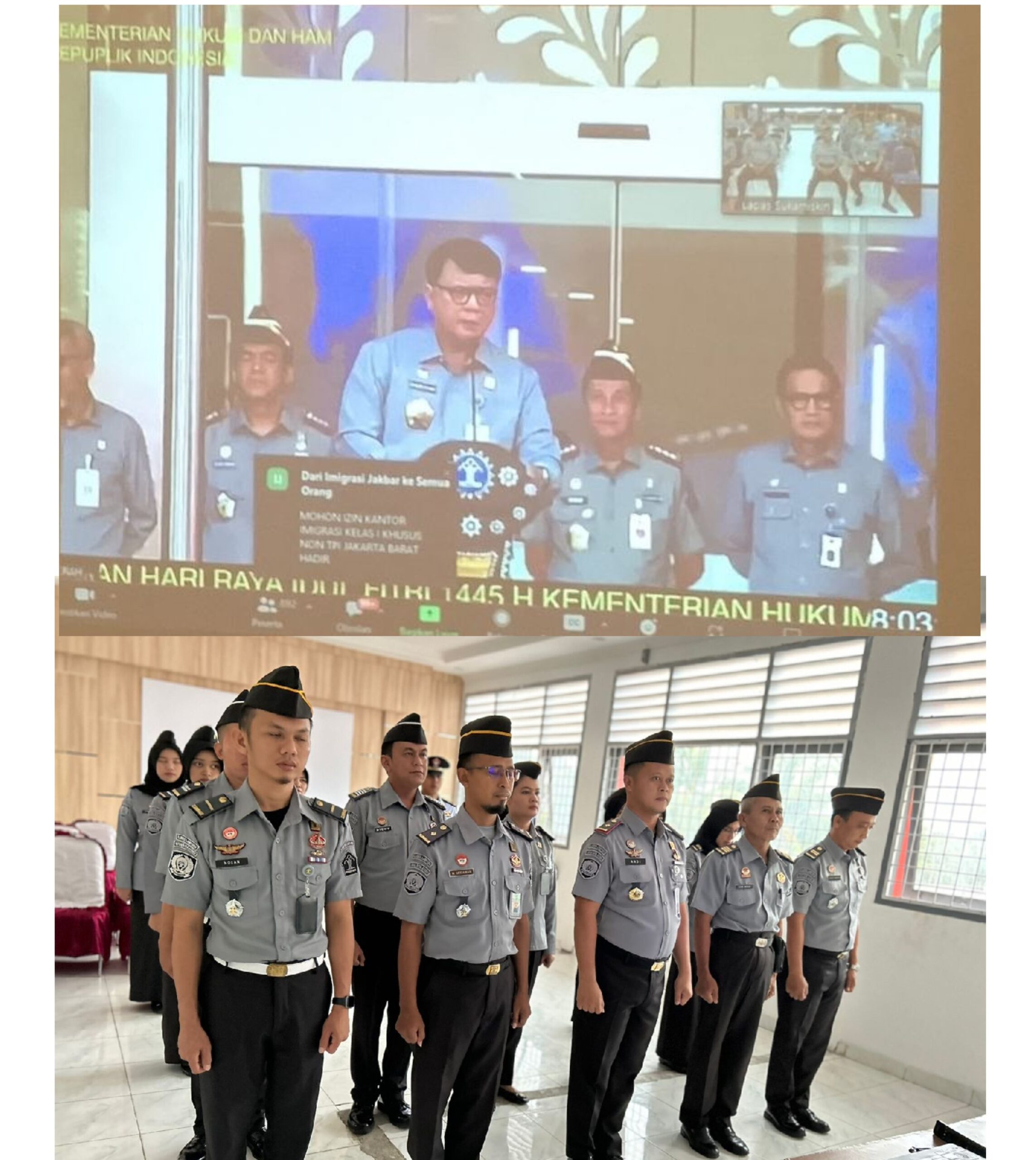 APEL KEMENKUM-HAM RI: Kalapas Kelas IIB Kotaagung Andi Gunawan beserta seluruh jajaran ASN dan staf menyimak seksama instruksi dan arahan dari Plh. Sekjen Kemenkum-HAM RI Irjen Pol Reynhard Silitonga sebelum pelaksanaan cuti bersama dan libur hari raya Idul Fitri 1445 H. (Foto-foto: DOK LAPAS KOTAAGUNG)