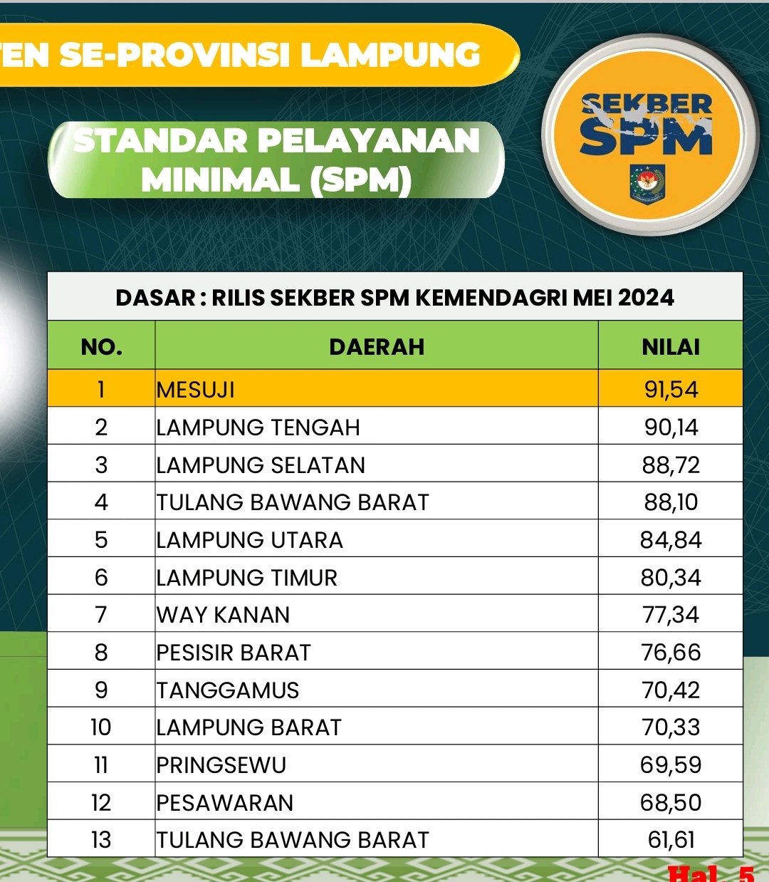 Pasalnya, Kabupaten Mesuji berhasil finis di urutan pertama Standar Pelayanan Minimal (SPM) se-Provinsi Lampung, berdasarkan Rilis Sekber SPM Permendagri pada Mei 2024 dengan Torehan Nilai 91,54 (Tabel Sekber SPM Kemendagri Mei 2024).