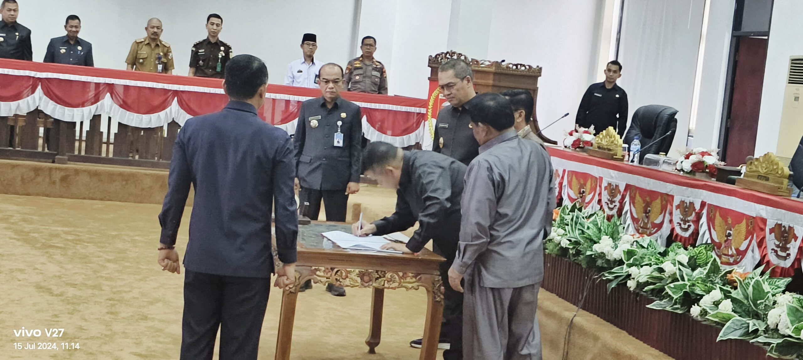 Penandatanganan nota kesepakatan oleh Ketua, Wakil ketua DPRD dan Sekda. Senin(15/7/2024) photo ;Dirman
