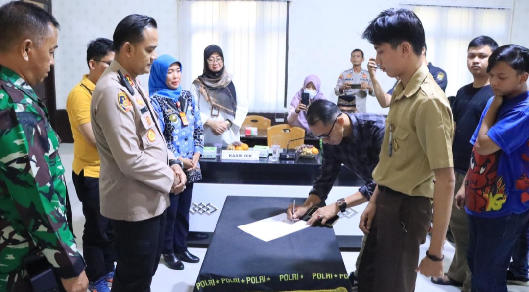 Para pelajar yang terlibat tauran geng motor membacakan Deklarasi Perjanjian dan Penandatanganan surat pernyataan oleh orang tua/wali murid dan murid dengan Isi sebagai berikut: