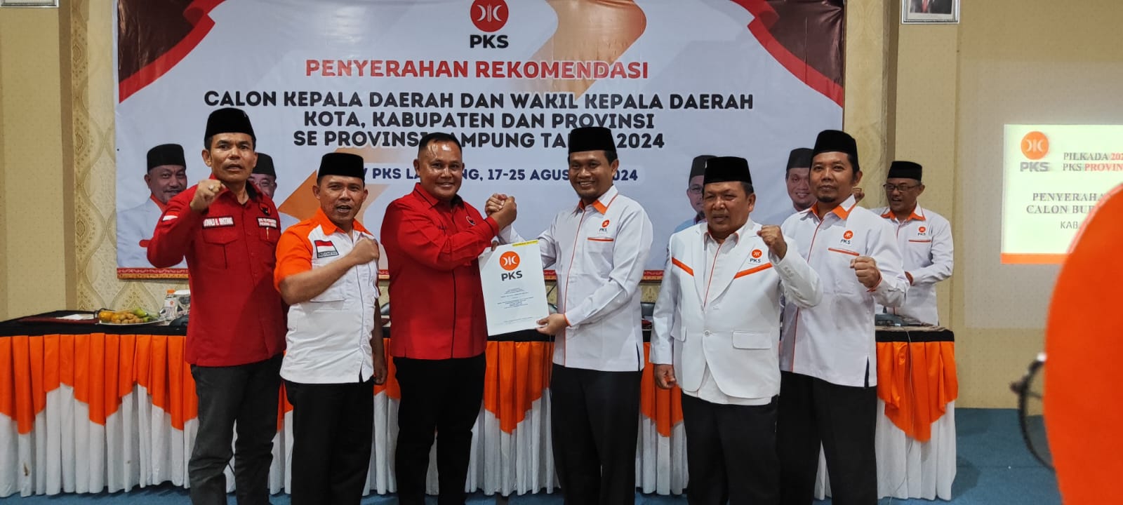 Translampung.id,KALIANDA – Partai Keadilan Sejahtera (PKS) akhirnya resmi serahkan rekomendasi untuk pilkada Lampung Selatan 2024 ke kandidat petahana Nanang Ermanto sebagai calon bupati dan Antoni Imam sebagai wakil bupati. Surat rekomendasi tersebut ditandatangani langsung oleh Presiden PKS Ahmad Syaikhu dan Sekretaris Jenderal Aboe Bakar Al-Habsyi dengan nomor : 629.10.2.C-1/SKEP/PKS/DPP/2024