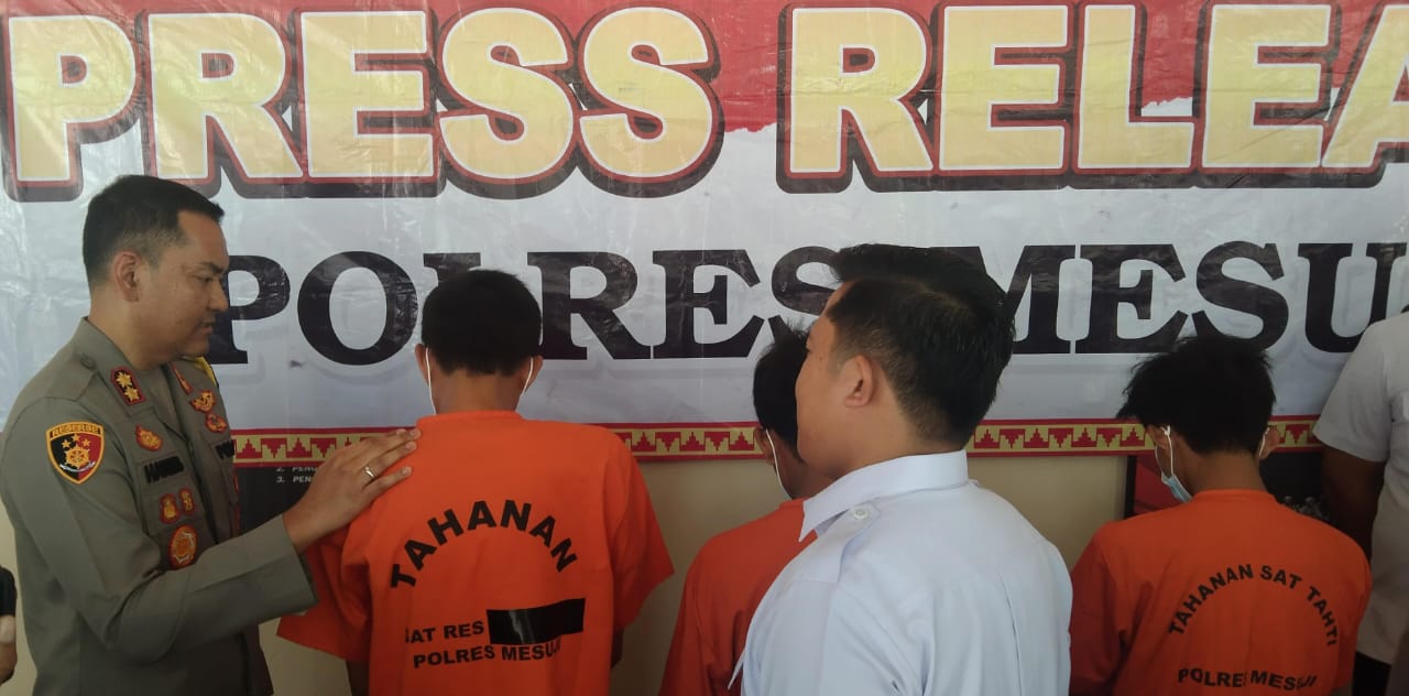 Dipaparkan Kapolres, ketiga orang diantaranya berinisial “JV” berhasil diamankan di Jalan Simpang Pematang, pada hari Rabu tanggal 7 Agustus 2024. Pengungkapan Polsek Simpang Pematang diawali dengan adanya informasi dari warga yang resah dengan adanya seseorang yang sering melakukan pemerasan atau pemalakan di kawasan Register 45 Kecamatan Mesuji Timur Kabupaten Mesuji.