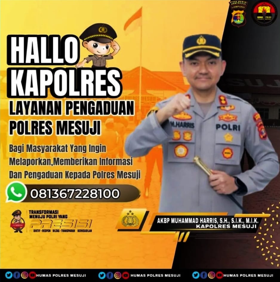 Kapolres Mesuji AKBP Muhammad Harris SH, SIK, MIK., meluncurkan program Hallo Kapolres dengan LAYANAN PENGADUAN POLRES MESUJI bagi masyarakat yang ingin melaporkan, atau memberikan informasi dan pengaduan kepada Polres Mesuji.