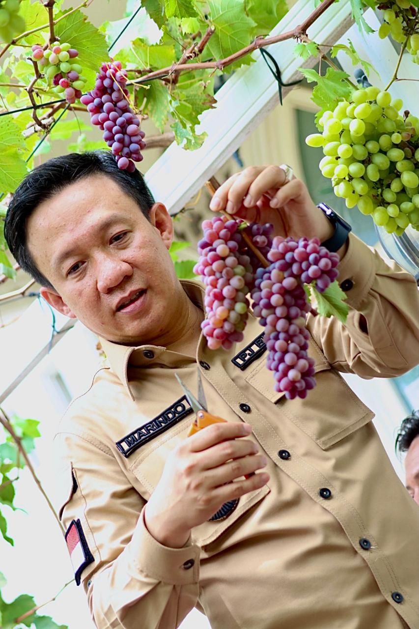 PRINGSEWU – Penjabat Bupati Pringsewu Marindo Kurniawan mengatakan prospek budidaya anggur di Kabupaten Pringsewu masih terbuka lebar, baik untuk kebutuhan konsumsi, pemasaran, maupun konsep agrowisata petik buah. Hal tersebut dilihat dari potensi lahan pekarangan di daerah ini yang dapat dimanfaatkan sebagai lahan untuk usaha budidaya anggur yang mencapai 3.508 hektar yang tersebar di sembilan kecamatan.