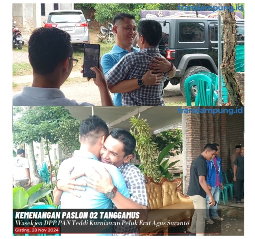 ”Paslon 02 menang, kader PAN Agus Suranto jadi Wakil Bupati Tanggamus!” teriak sesosok pria tinggi gagah yang turun dari mobil tersebut. Rupanya dia adalah Teddi Kurniawan, S.E. yang kini menjabat sebagai Wasekjen Dewan Pimpinan Pusat (DPP) PAN. Sontak Agus Suranto berlari menghampiri Teddi Kurniawan.