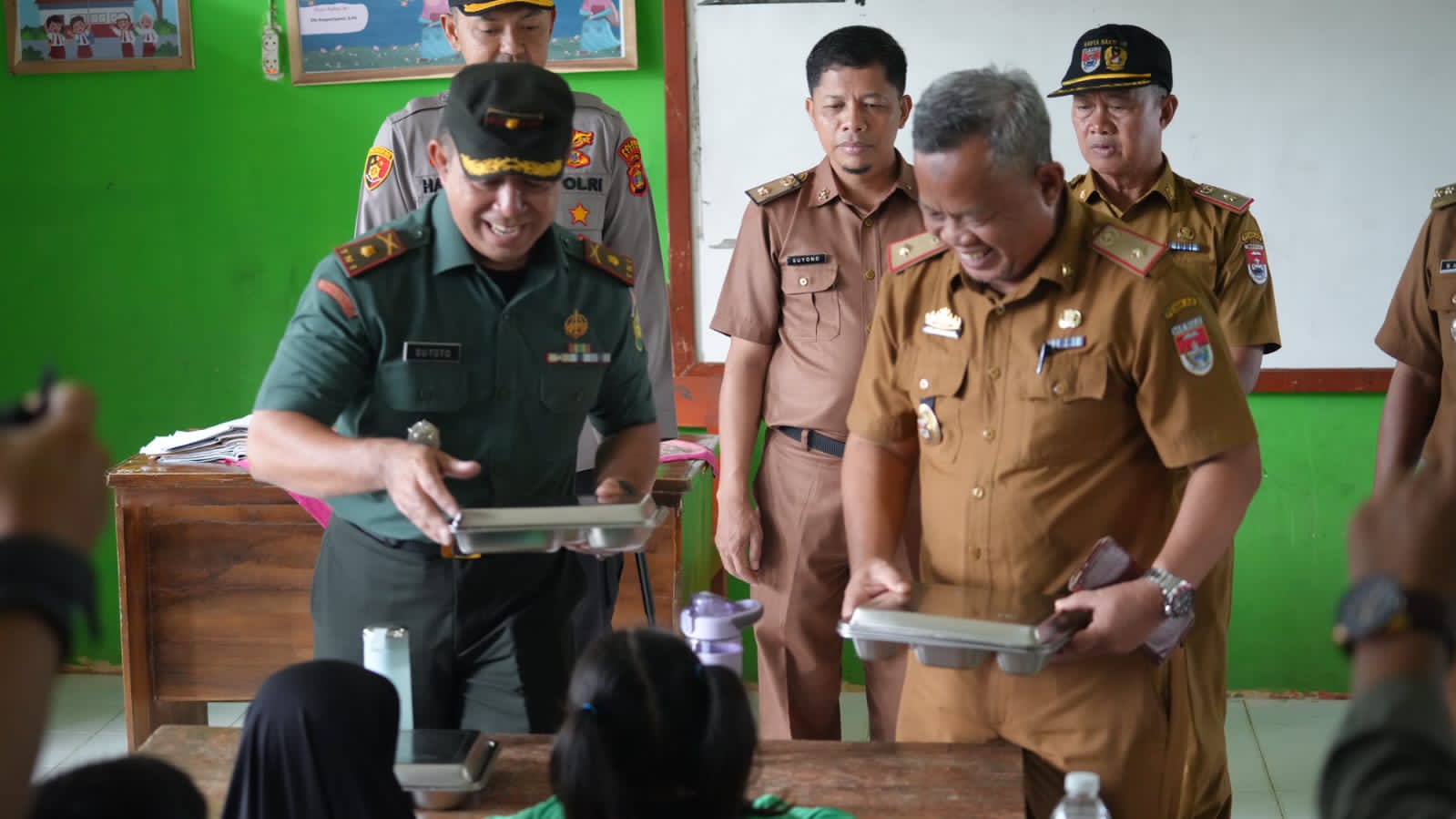 Setelah itu, pimpinan Forkopimda langsung ikut mengecek MBG yang sedang dihidangkan ke siswa-siswi di sekolah.