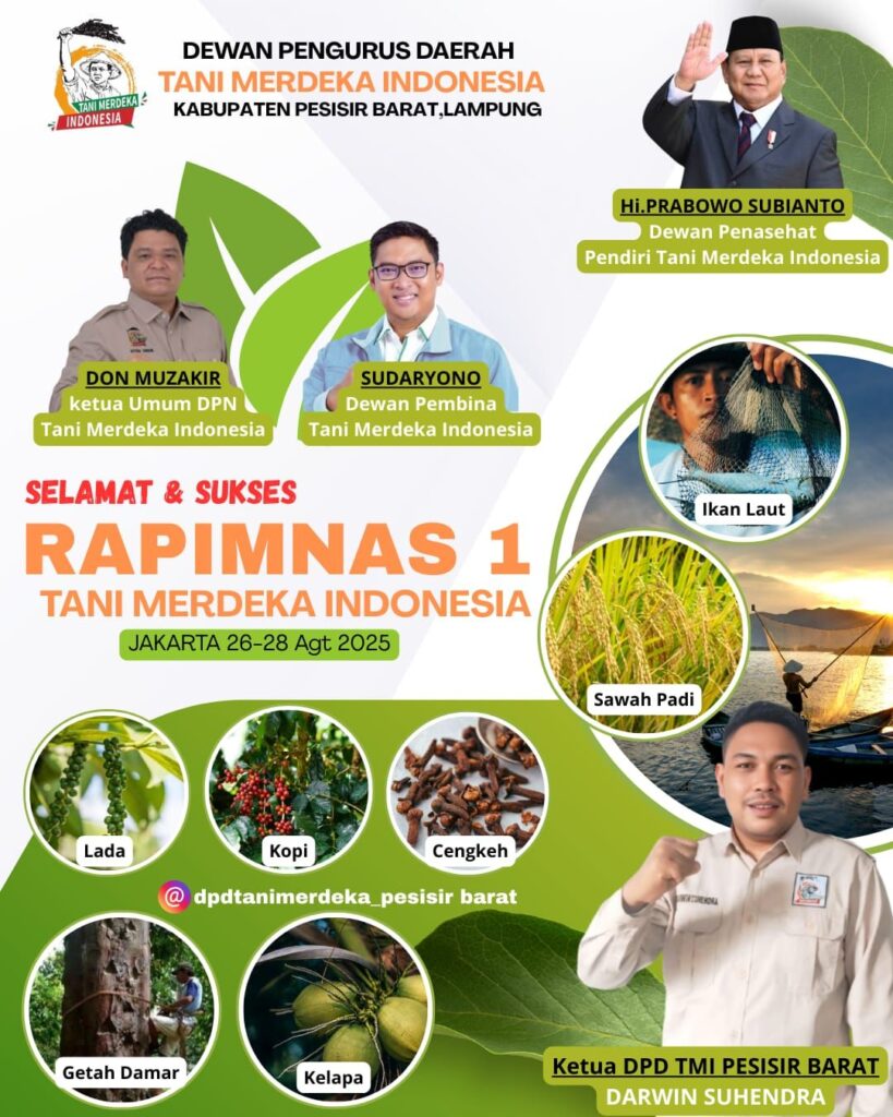 Translampung.id, Pesisir Barat– Jelang Pelaksanaan Rapat Pimpinan Nasional (RAPIMNAS 1) Tani Merdeka Indonesia, Dewan Pengurus Daerah (DPD) Tani Merdeka Indonesia Pesisir Barat, Mendukung penuh dan siap mengirim delegasi, sebagi bentuk dukungan program Presiden Prabowo dan memperjuangkan kepentingan petani, khususnya di Pesisir Barat.