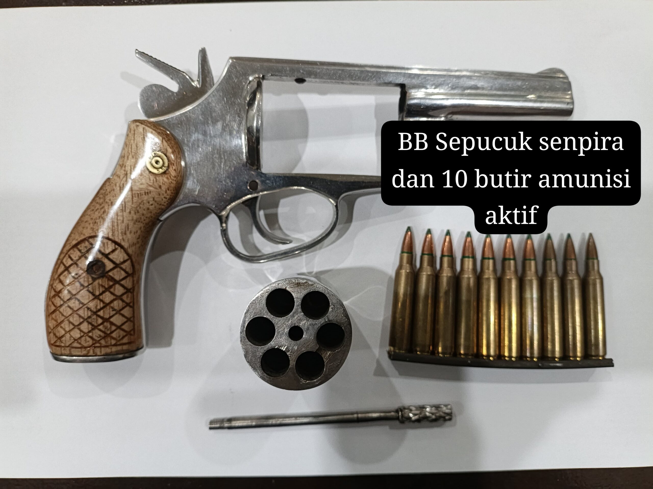 “Saat ini tersangka bersama barang bukti 1 pucuk senpira jenis revolver, 10 butir amunisi aktif dengan kaliber 5.56 mm, 1 buah handphone, dan 1 buah tas selempang berwarna hitam telah diamankan di Mapolres guna pemeriksaan lebih lanjut. Atas perbuatannya tersangka akan di jerat dengan Pasal 306 ayat 1 KUHP dengan ancaman hukuman paling lama 10 Tahun penjara,”pungkasnya. (Nara)
