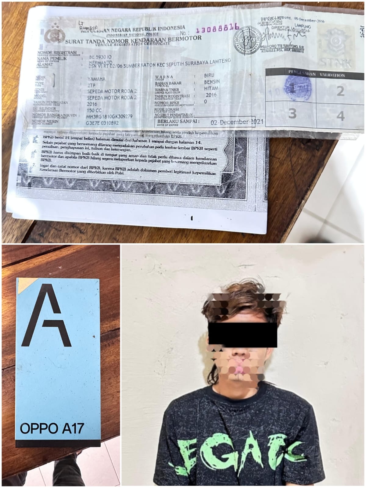 Ketiga tersangka di tangkap pada Hari Rabu 22 April 2026, adapun identitas tersangka adalah RN (21) Warga Desa Labuhan Batin Kecamatan Way Serdang Kabupaten Mesuji, SN (23) Warga Sungai Belida Kecamatan Lempuing Jaya Kabupaten Ogan Komering Ilir (OKI), dan SI (42) Warga Sungai Belida Kecamatan Lempuing Jaya Kabupaten OKI.